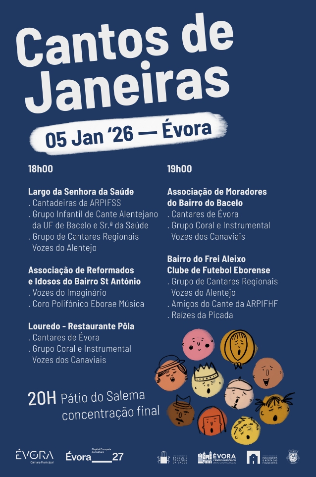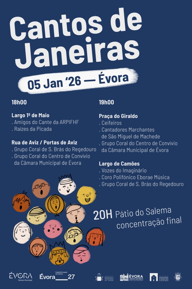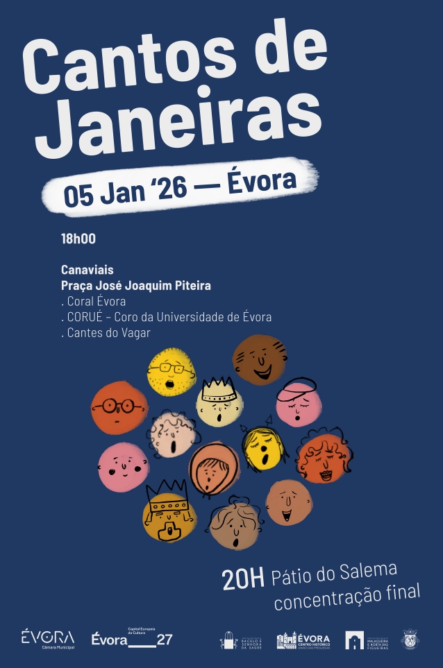 É já no próximo dia 5 de janeiro, 2ª feira, que os Cantos de Janeiras voltam a fazer-se escutar, em Évora, para dar as boas-vindas a 2026. A partir das 18h00, com atuações no centro histórico e nos bairros e apresentações finais, a partir das 20h00, com todos os participantes no Páteo do Salema onde terá lugar um caloroso convívio com lume de chão e o tradicional petisco, para o qual se convida toda a população.