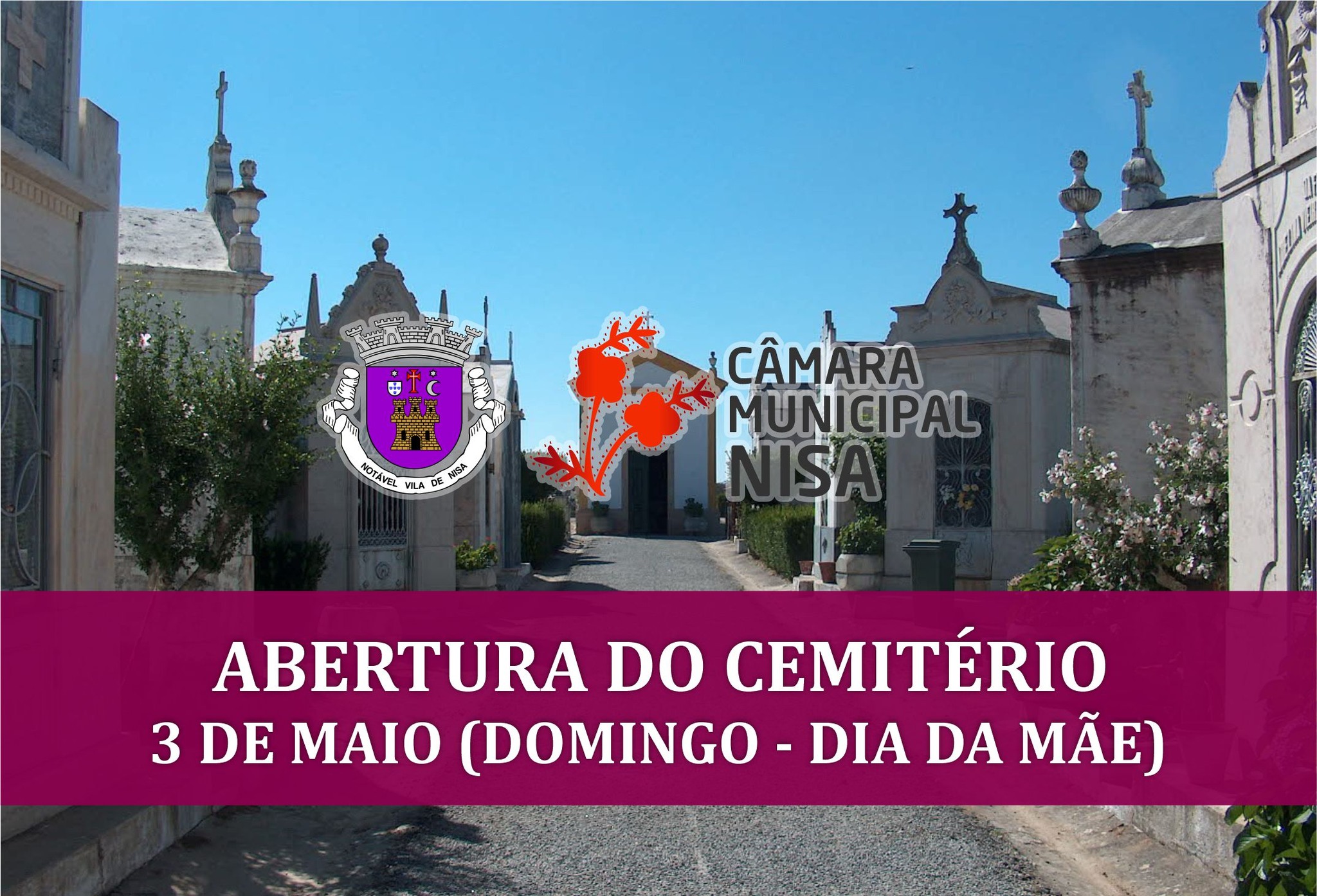 ⚠️ Informa-se a população que o Cemitério de Nisa estará aberto no próximo domingo (3 de maio) Dia da Mãe, das 8h às 12h e das 14h às 17h.