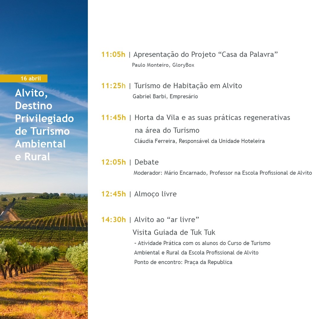 Dia 16 de abril, Alvito debate o futuro do turismo reunindo especialistas e profissionais para refletir sobre o desenvolvimento sustentável do território.